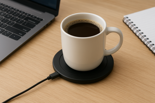 Selvvarmende koppunderlag: Holder kaffen varm mens du jobber.